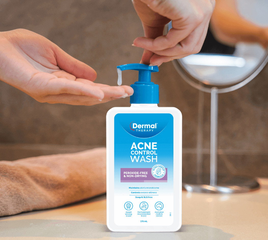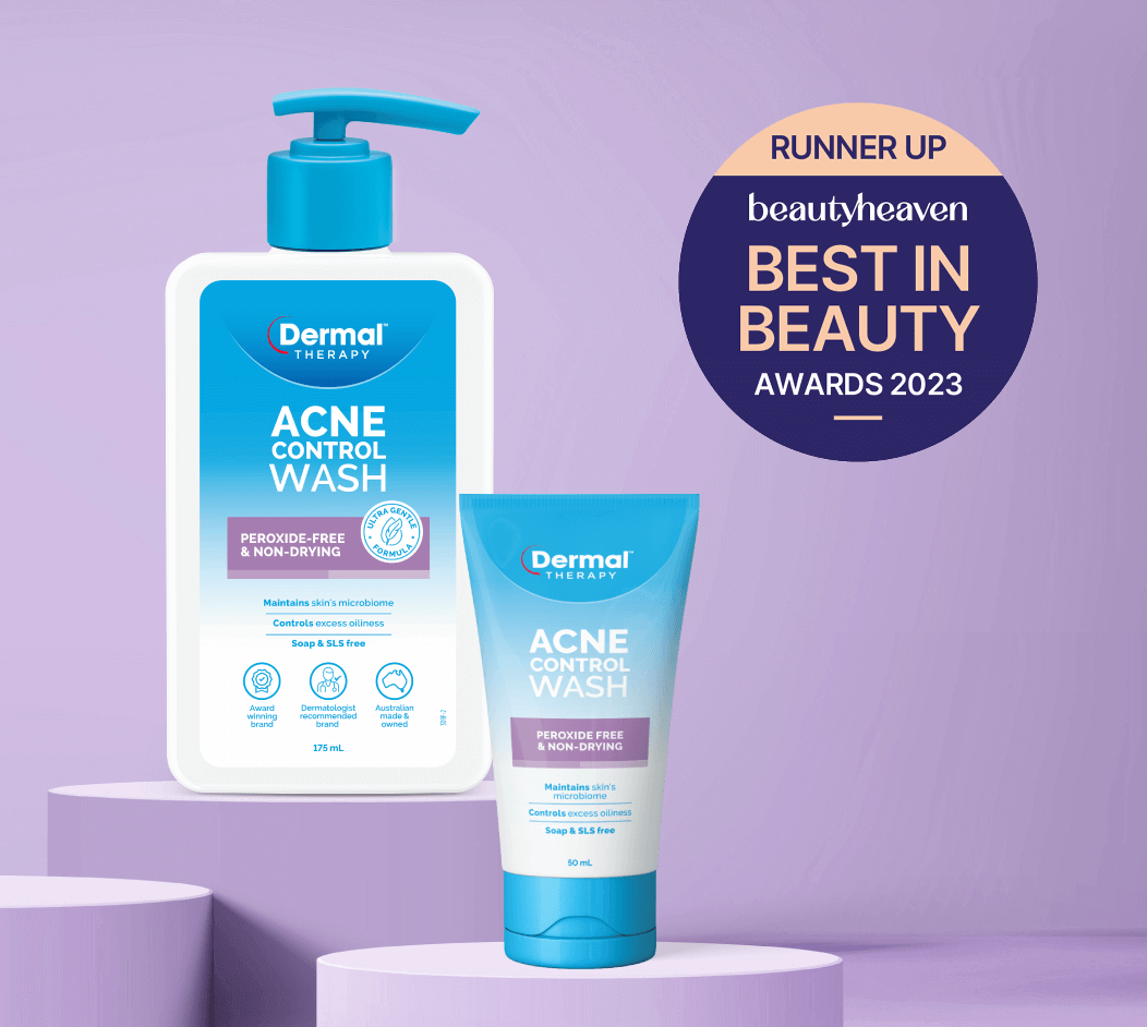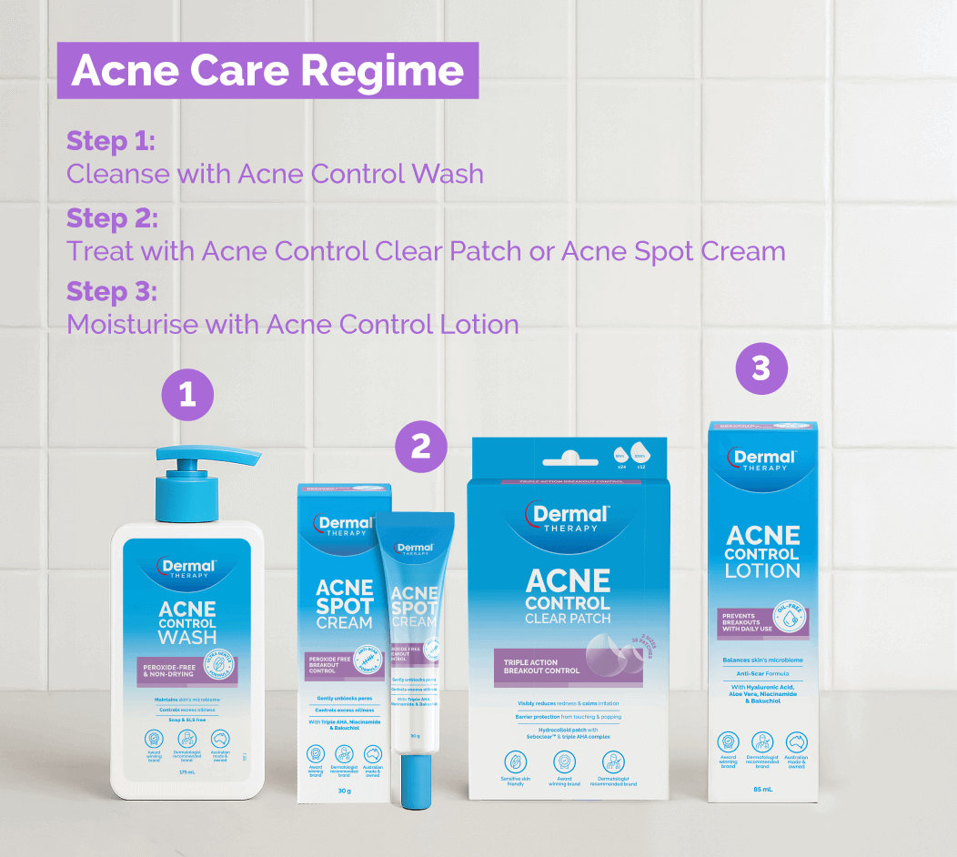 Dermal Therapy Acne Control skincare products including wash, spot cream, clear patch, and lotion displayed against a tiled background.