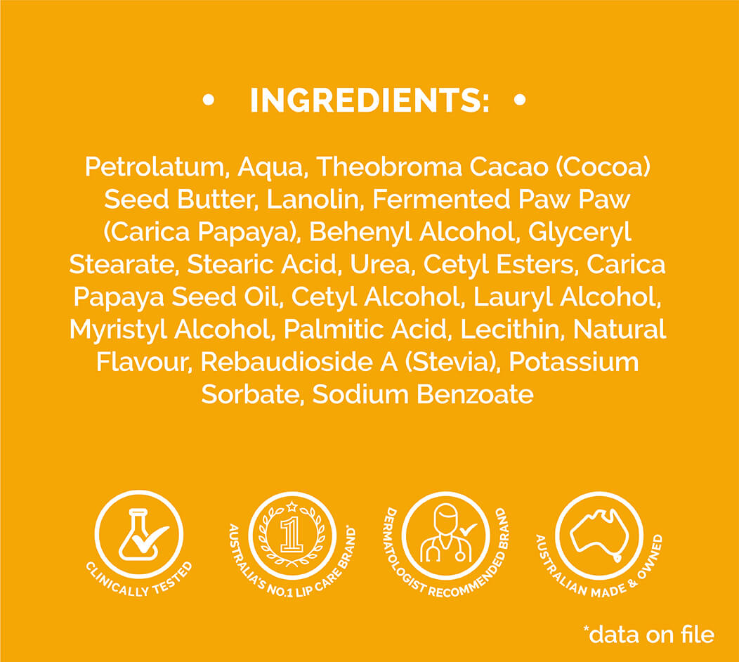Petrolatum, Aqua, Theobroma Cacao (Cocoa) Seed Butter, Lanolin, Fermented Paw Paw (Carica Papaya), Behenyl Alcohol, Glyceryl Stearate, Stearic Acid, Urea, Cetyl Esters, Carica Papaya Seed Oil, Cetyl Alcohol, Lauryl Alcohol, Myristyl Alcohol, Palmitic Acid, Lecithin, Natural Flavour, Rebaudioside A (Stevia), Potassium Sorbate, Sodium Benzoate