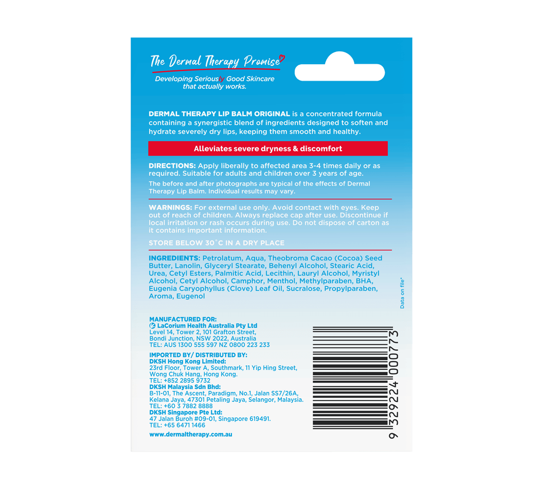 Dermal Therapy Lip Balm Original is from Australia’s No.1 lip balm brand*, clinically tested to deliver visible results in just 1 day.