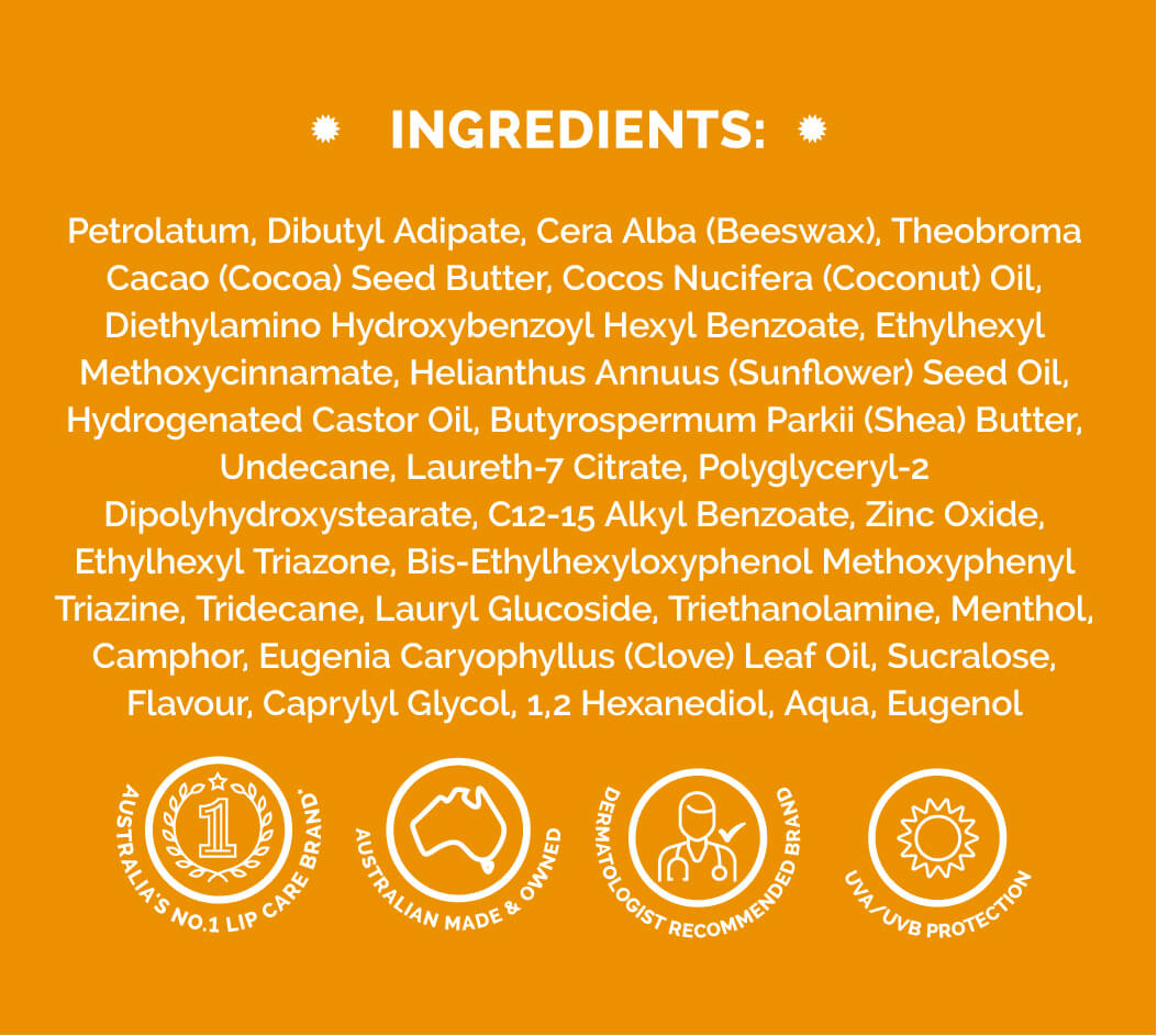 Petrolatum, Dibutyl Adipate, Cera Alba (Beeswax), Theobroma Cacao (Cocoa) Seed Butter, Cocos Nucifera (Coconut) Oil, Diethylamino Hydroxybenzoyl Hexyl Benzoate, Ethylhexyl Methoxycinnamate, Helianthus Annuus (Sunflower) Seed Oil, Hydrogenated Castor Oil, Butyrospermum Parkii (Shea) Butter, Undecane, Laureth-7 Citrate, Polyglyceryl-2 Dipolyhydroxystearate, C12-15 Alkyl Benzoate, Zinc Oxide, Ethylhexyl Triazone, Bis-Ethylhexyloxyphenol Methoxyphenyl Triazine, Tridecane, Lauryl Glucoside, Triethanolamine, Menthol, Camphor, Eugenia Caryophyllus (Clove) Leaf Oil, Sucralose, Flavour, Caprylyl Glycol, 1,2 Hexanediol, Aqua, Eugenol