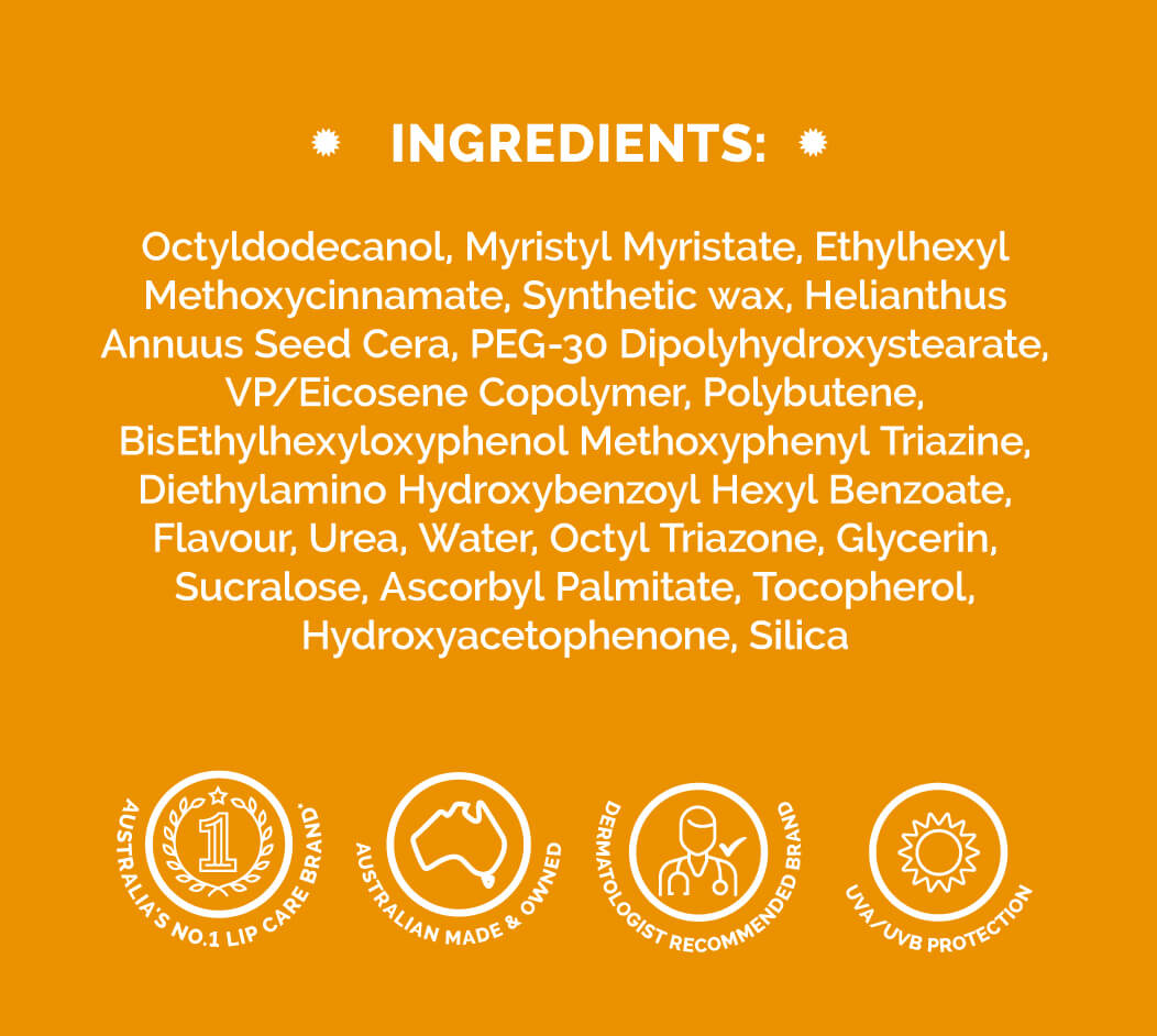 Octyldodecanol, Myristyl Myristate, Ethylhexyl Methoxycinnamate, Synthetic wax, Helianthus Annuus Seed Cera, PEG-30 Dipolyhydroxystearate, VP/Eicosene Copolymer, Polybutene, BisEthylhexyloxyphenol Methoxyphenyl Triazine, Diethylamino Hydroxybenzoyl Hexyl Benzoate, Flavour, Urea, Water, Octyl Triazone, Glycerin, Sucralose, Ascorbyl Palmitate, Tocopherol, Hydroxyacetophenone, Silica