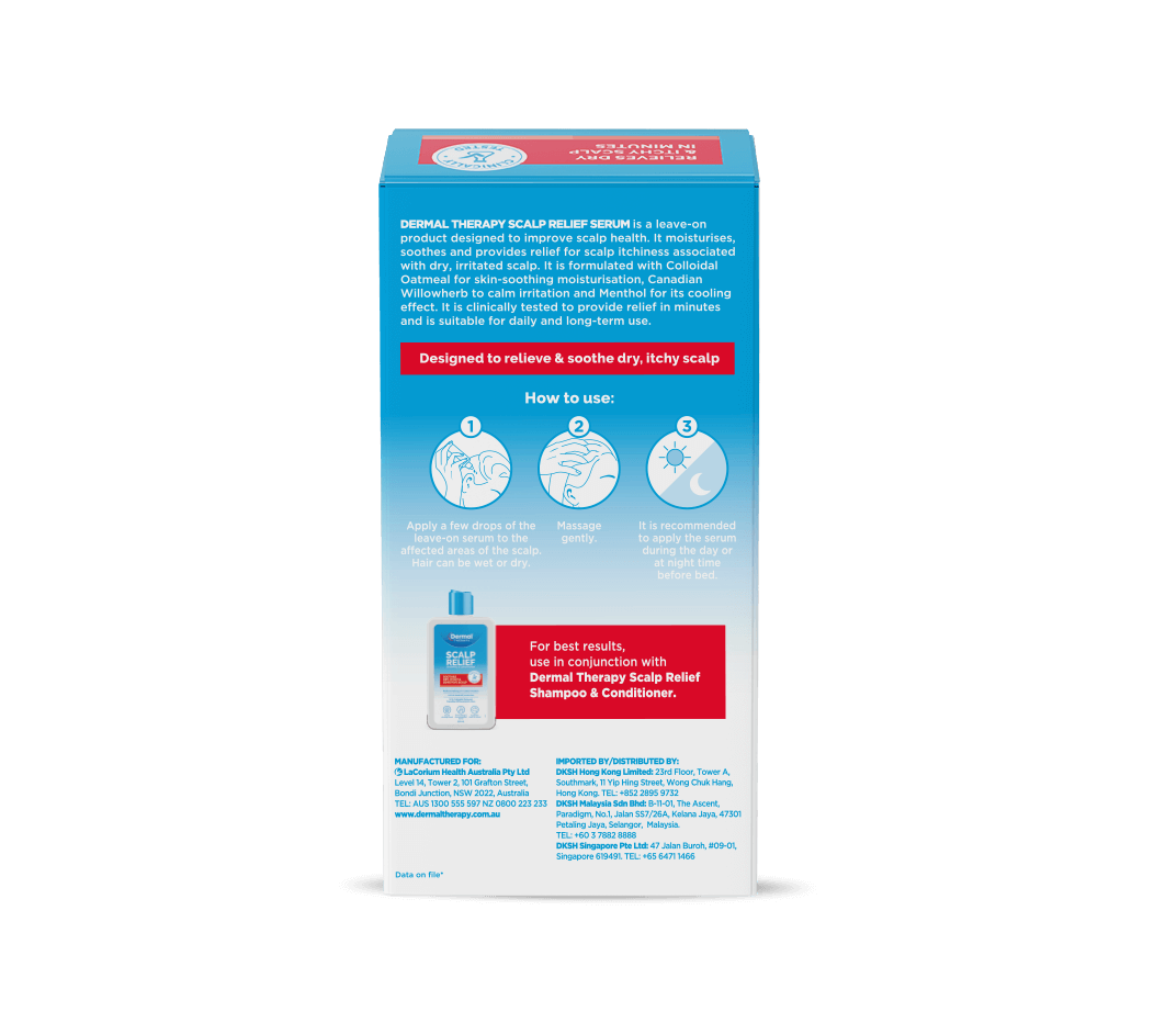 Enjoy skin-soothing moisturisation and a scalp left feeling calm and cool with Dermal Therapy Scalp Relief Serum, clinically tested to provide relief from scalp itchiness associated with irritated dry scalp, in minutes.