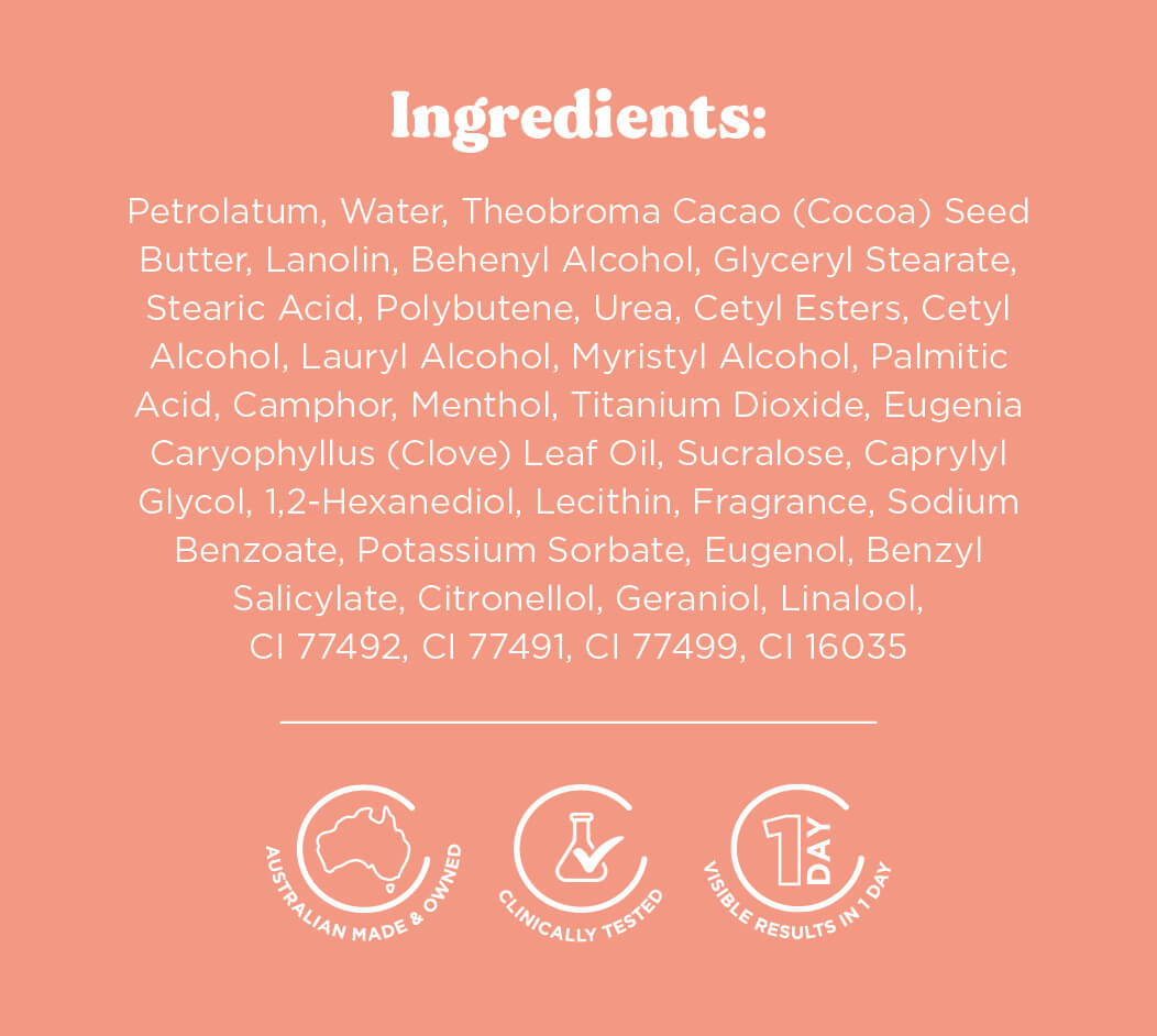 Petrolatum, Water, Theobroma Cacao (Cocoa) Seed Butter, Lanolin, Behenyl Alcohol, Glyceryl Stearate, Stearic Acid, Polybutene, Urea, Cetyl Esters, Cetyl Alcohol, Lauryl Alcohol, Myristyl Alcohol, Palmitic Acid, Camphor, Menthol, Titanium Dioxide, Eugenia Caryophyllus (Clove) Leaf Oil, Sucralose, Caprylyl Glycol, 1,2-Hexanediol, Lecithin, Fragrance, Sodium Benzoate, Potassium Sorbate, Eugenol, Benzyl Salicylate, Citronellol, Geraniol, Linalool, CI 77492, CI 77491, CI 77499, CI 16035